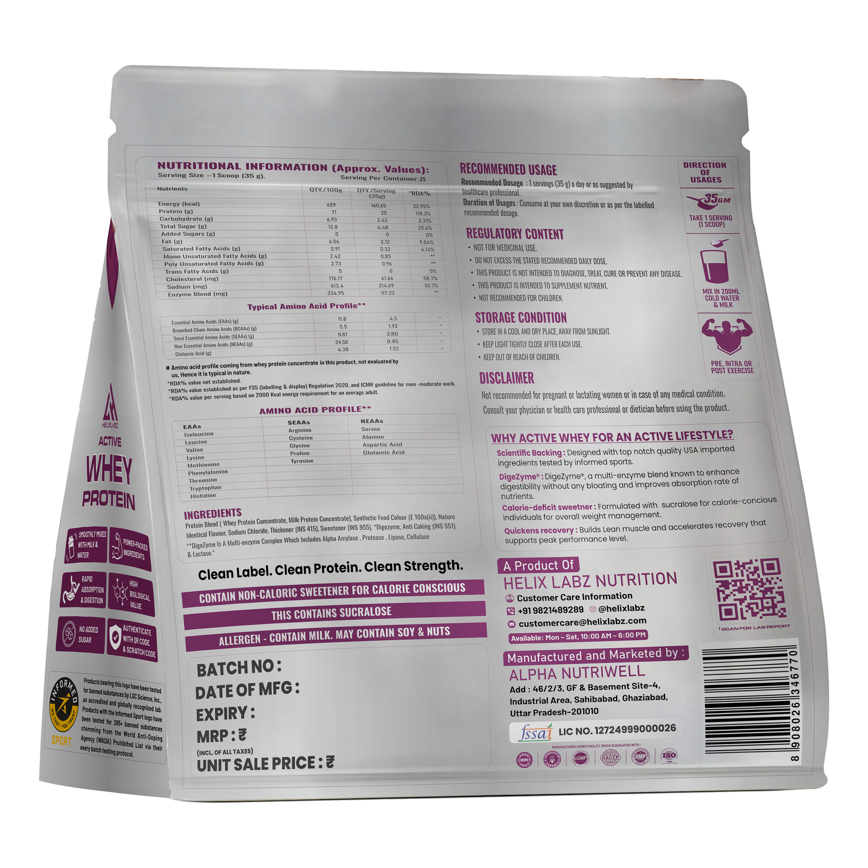 HelixLabz Active Whey Protein delivers premium muscle-building nutrition in every scoop. This Informed Sport Certified formula ensures you're getting a clean, tested product free from banned substances—perfect for serious athletes and fitness enthusiasts. With 25 servings per 900g pack, you get consistent quality to support your training goals. Each serving provides the protein your body needs to recover stronger and build lean muscle mass. Whether you're hitting the gym or recovering post-workout, Active Whey Protein is your reliable partner in achieving peak performance.